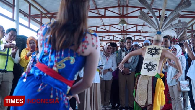 TIMES Flores/Cawapres Nomor urut 02, Sandiaga Salahuddin Uno disambut dengan upacara adat Tetek Pantan saat tiba di Bandara Tjilik Riwut Palangkaraya, Kalimantan, Senin (04/02/2019). (FOTO: Tofik For TIMES Indonesia)